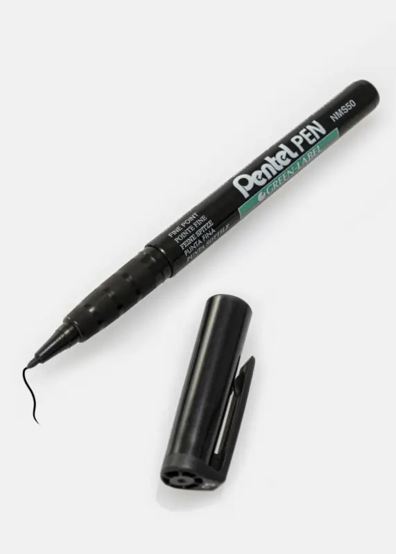 Zwarte pen van Pentel waarmee je op de meeste ondergronden kunt schrijven. De pen heeft een puntbreedte van 0,8 mm.