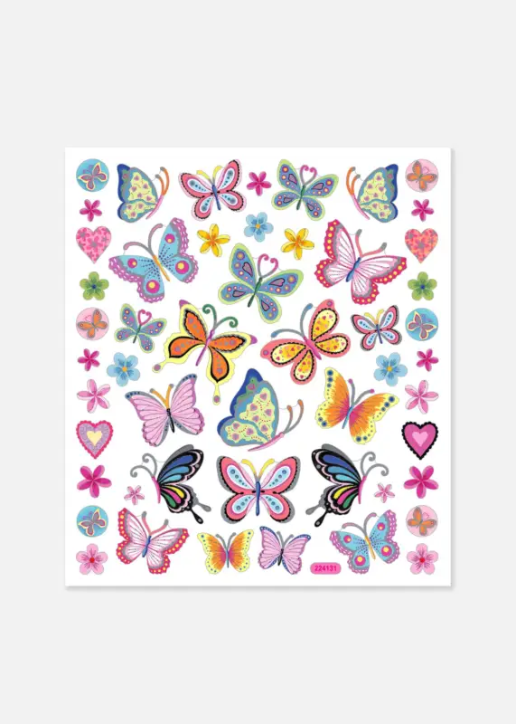 Geef je spullen een boost met onze zelfklevende plastic stickers “Kleurrijke Vlinders”. Deze stickers zijn versierd met mooie details van glanzende folie die een extra vleugje elegantie en kleur geven. Elk vel meet 15×16,5 cm en bevat een verscheidenheid aan vlinders in levendige kleuren.